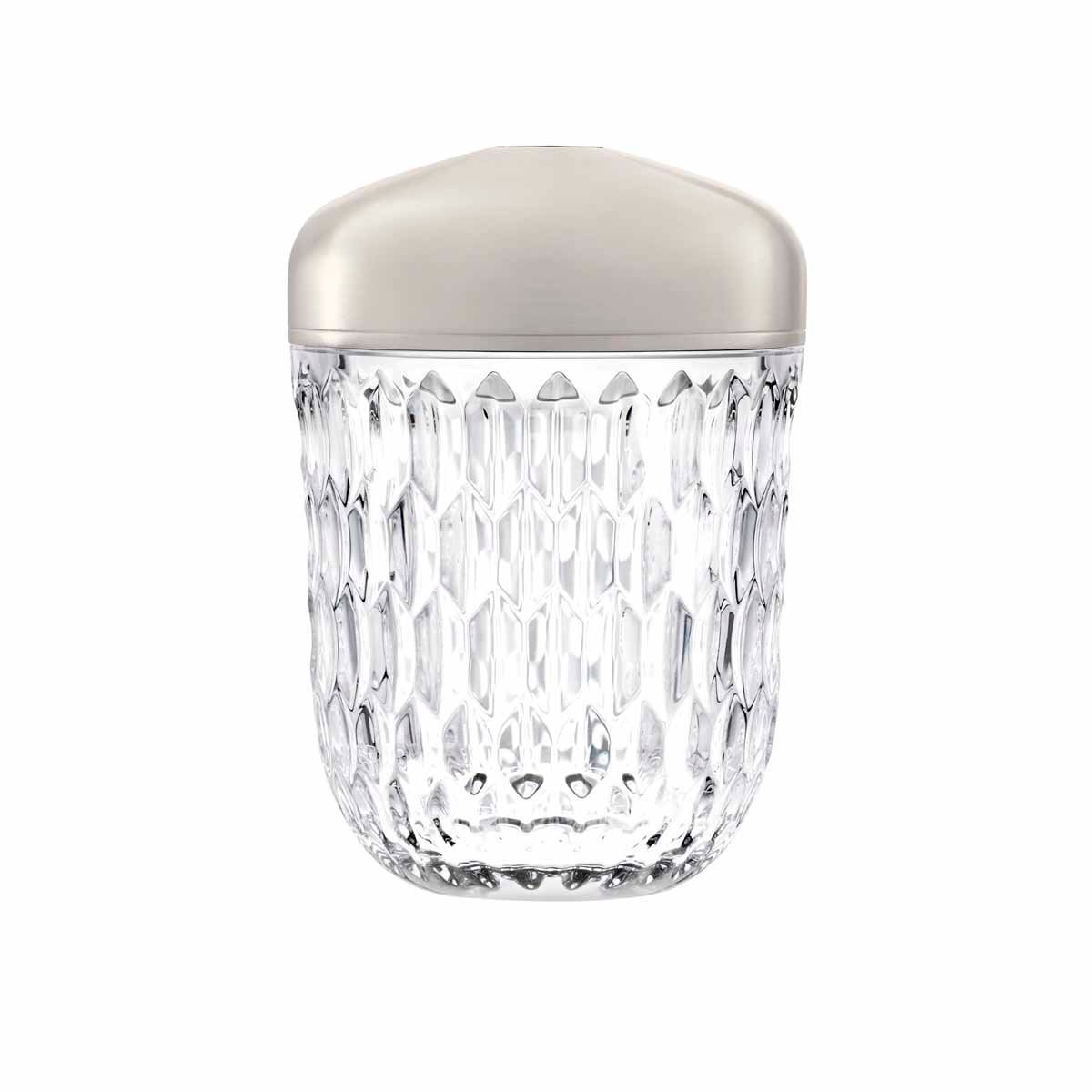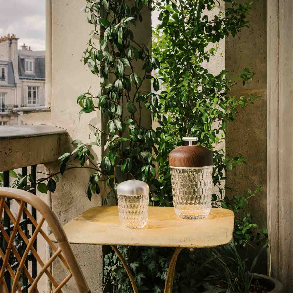 The Folia mini lamp features a clear crystal cut base and is available in three exquisite aluminum finishes: light gold, delicate copper, and silver. Its sleek design effortlessly complements any interior aesthetic. This rechargeable lamp offers adjustable brightness to suit your desired ambiance and mood, featuring two light temperatures and three intensity levels. Whether you prefer a gentle morning glow or an intimate evening ambiance, the mini lamp adapts seamlessly to your lighting needs.